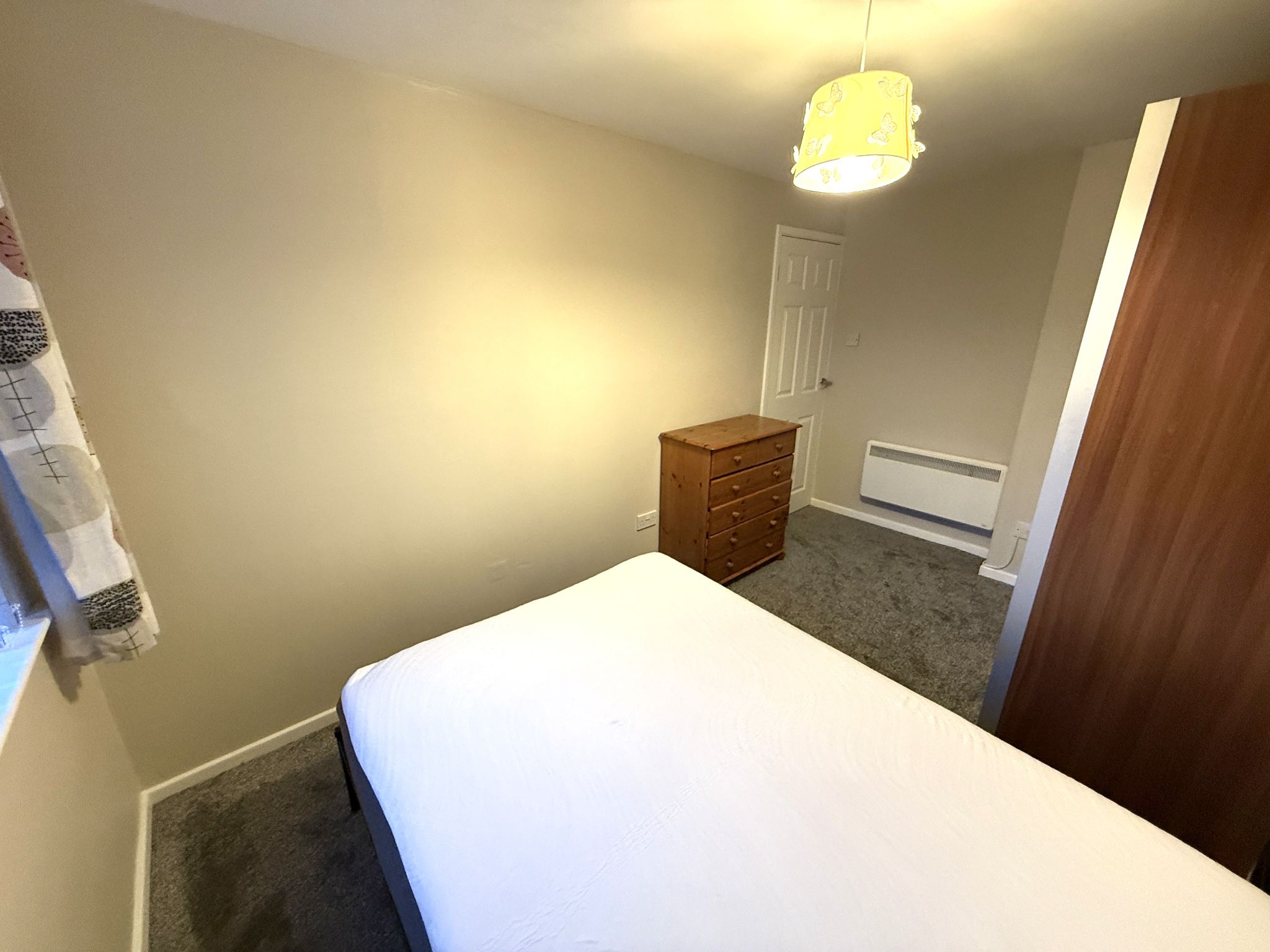 Large dobuel bedroom with double bed, fitted wardrobes and chest of drawers.