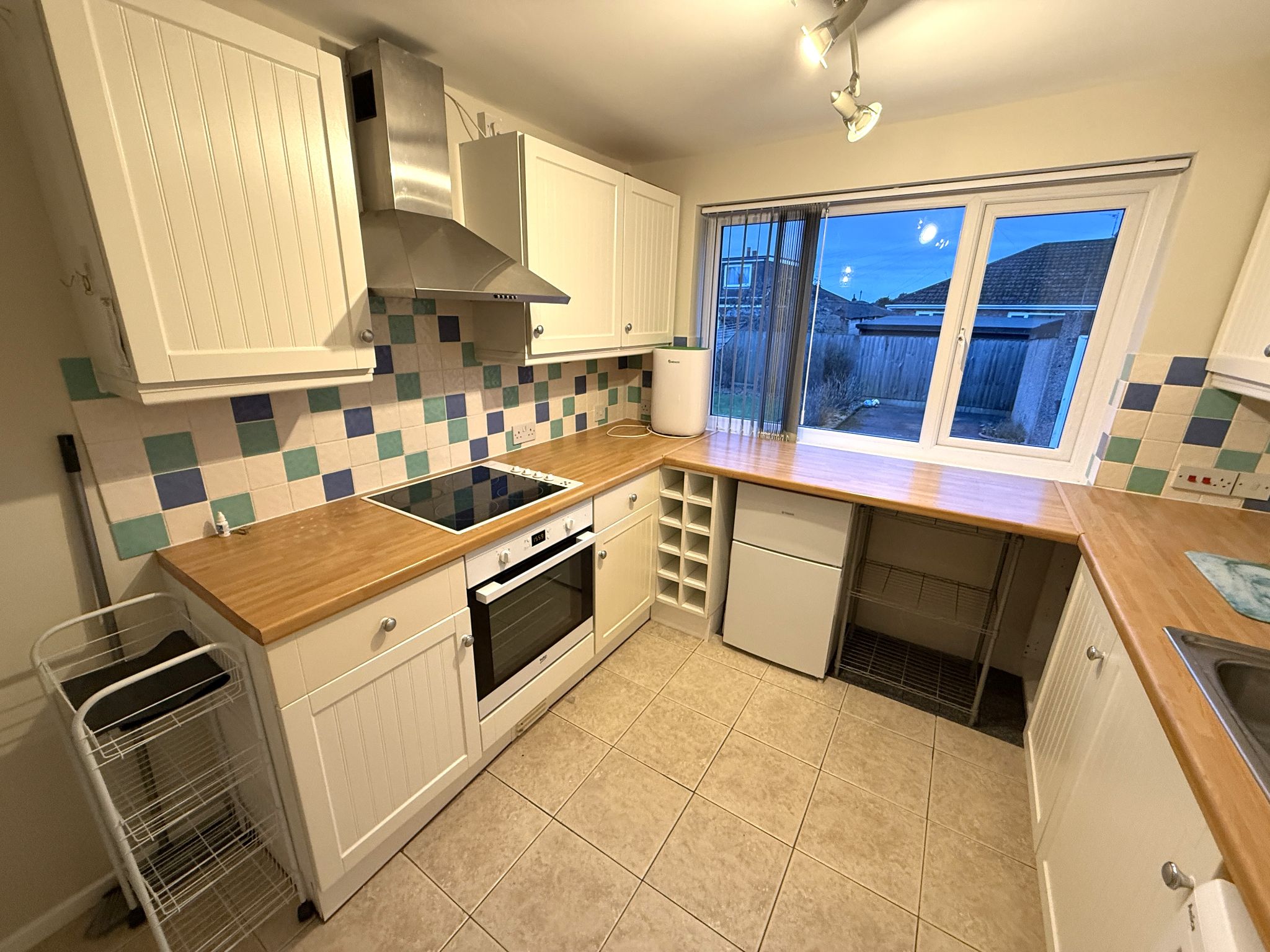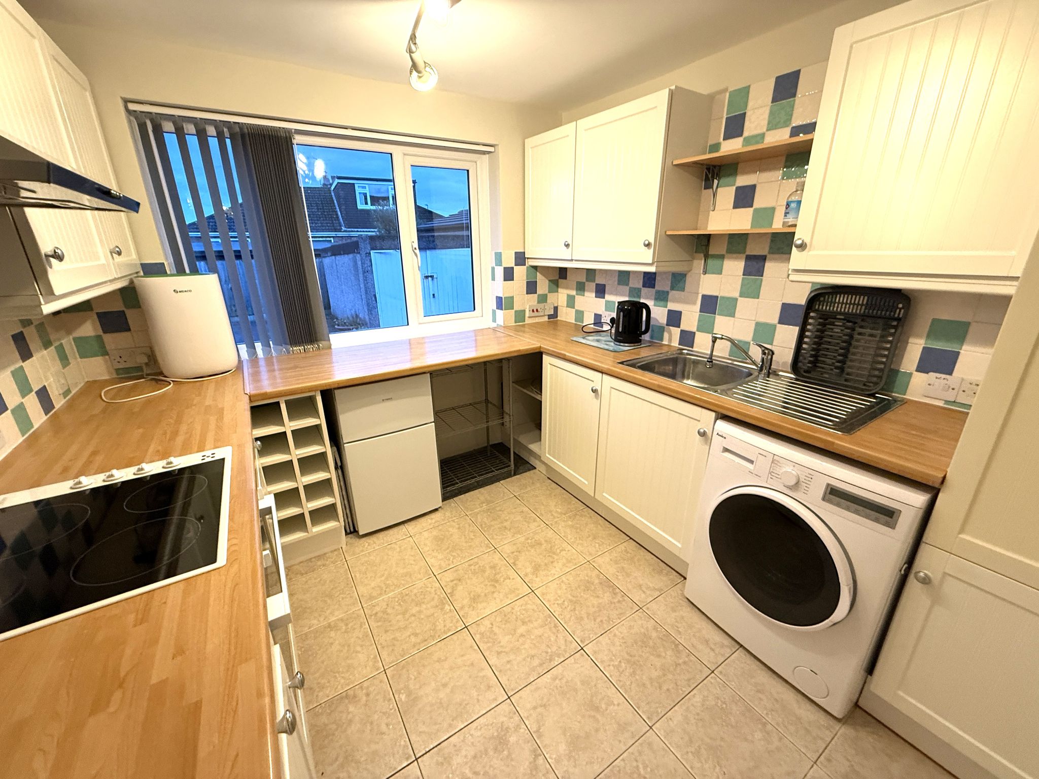 Modern fitted kitchen with cream wall & base units, wooden effect worktops, washing machine, fridge/freezer, integrated oven, hob and extractor.
