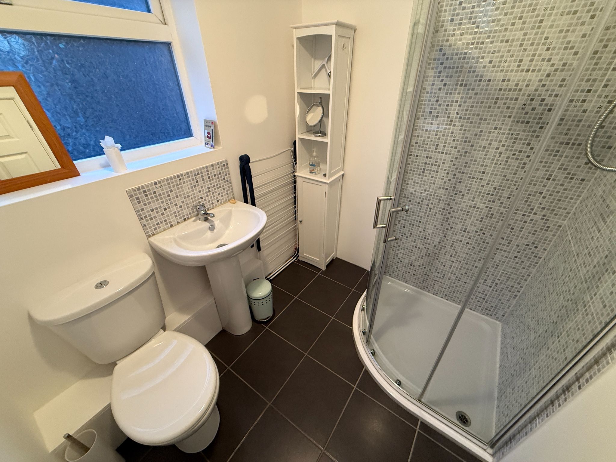 Modern bathroom with dark grey tiled flooring, WC, basin and large walk-in shower.