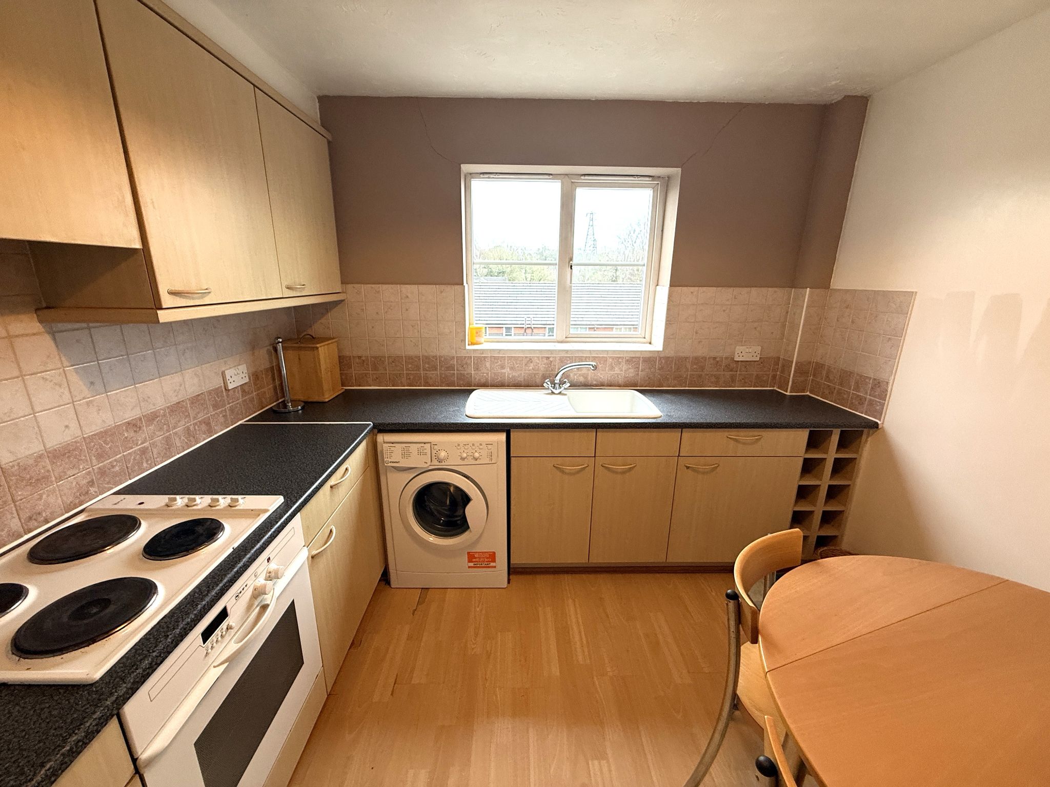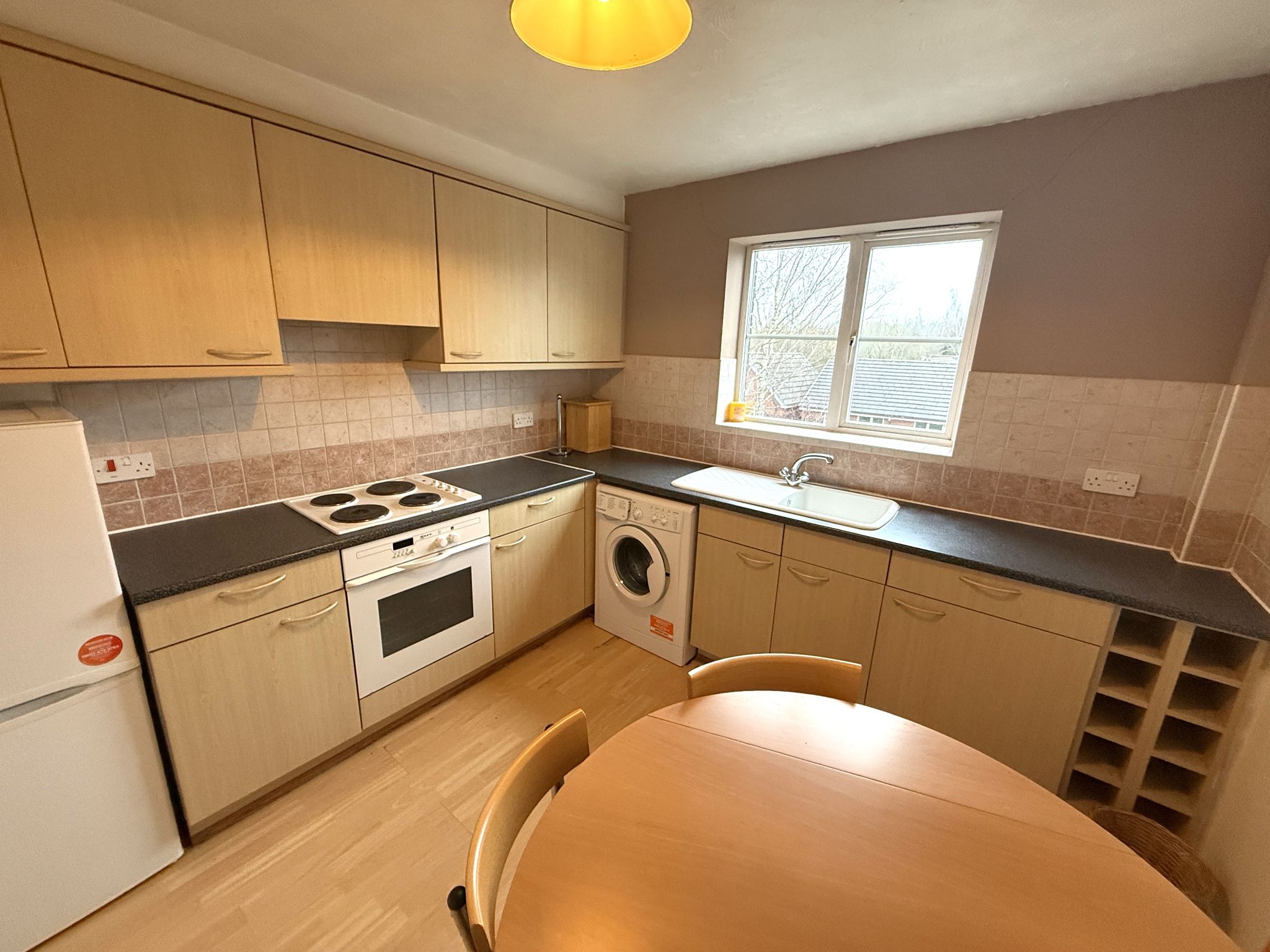 Fitted kitchen, with wooden wall & base units, black granite effect worktops, wood laminate flooring and part tiled walls. Comes with integrated appliances.