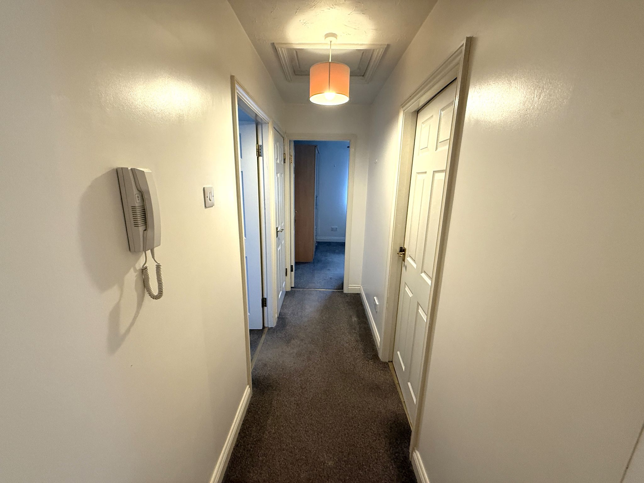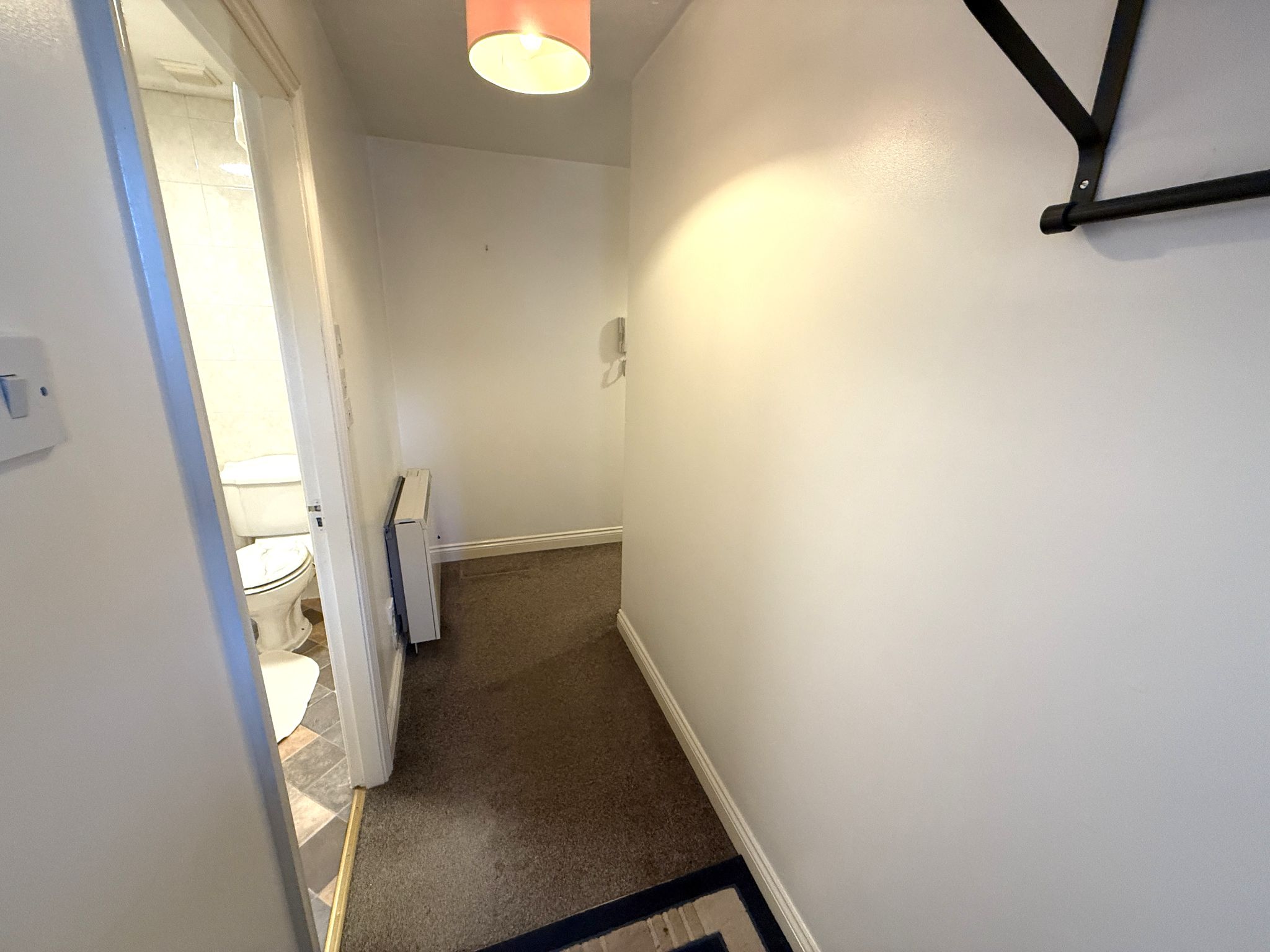 L-shaped hallway with carpet and storage cupboard. Leading to......