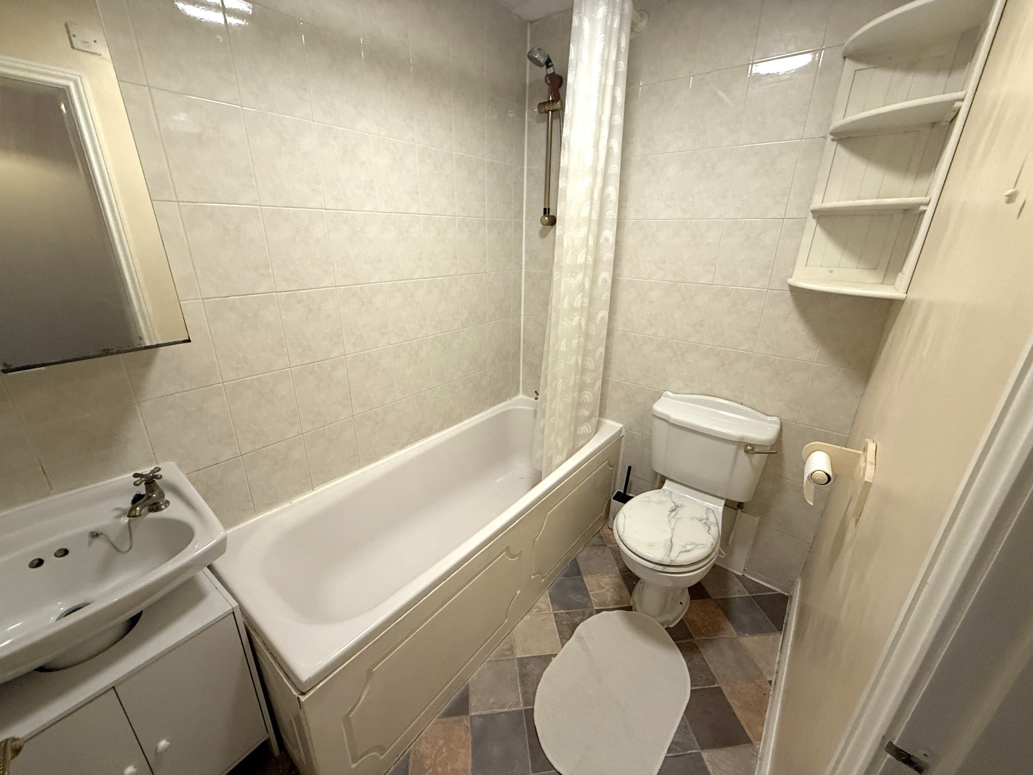 Fully tiled bathroom, with laminate flooring, WC, basin and shower over bath.