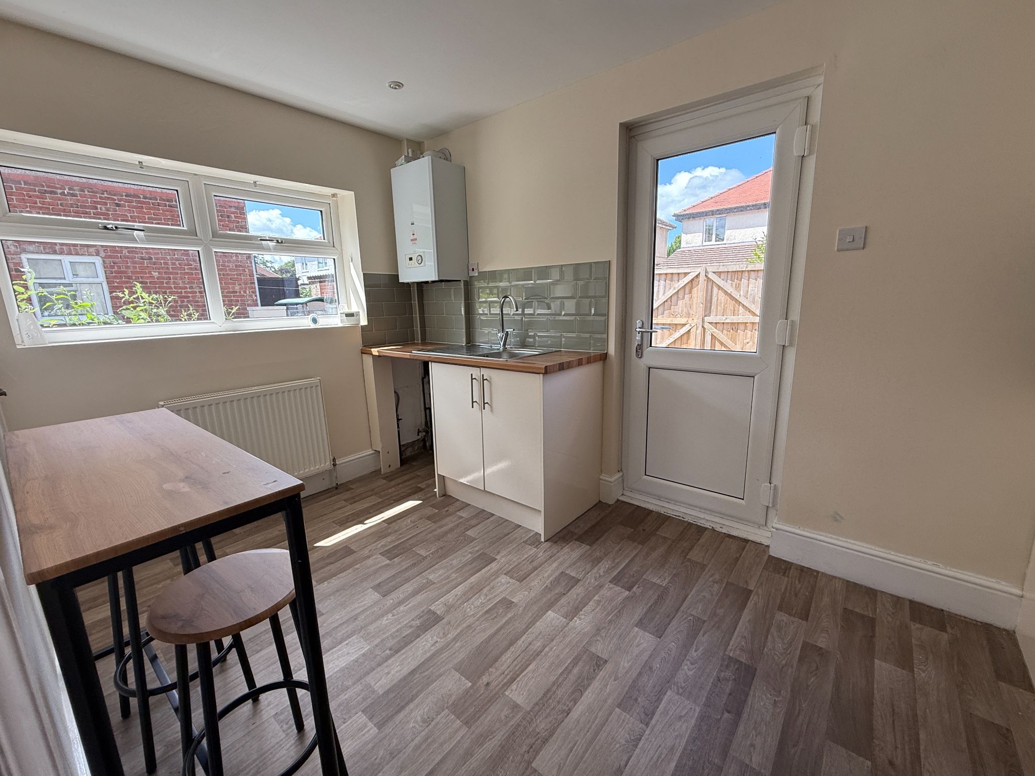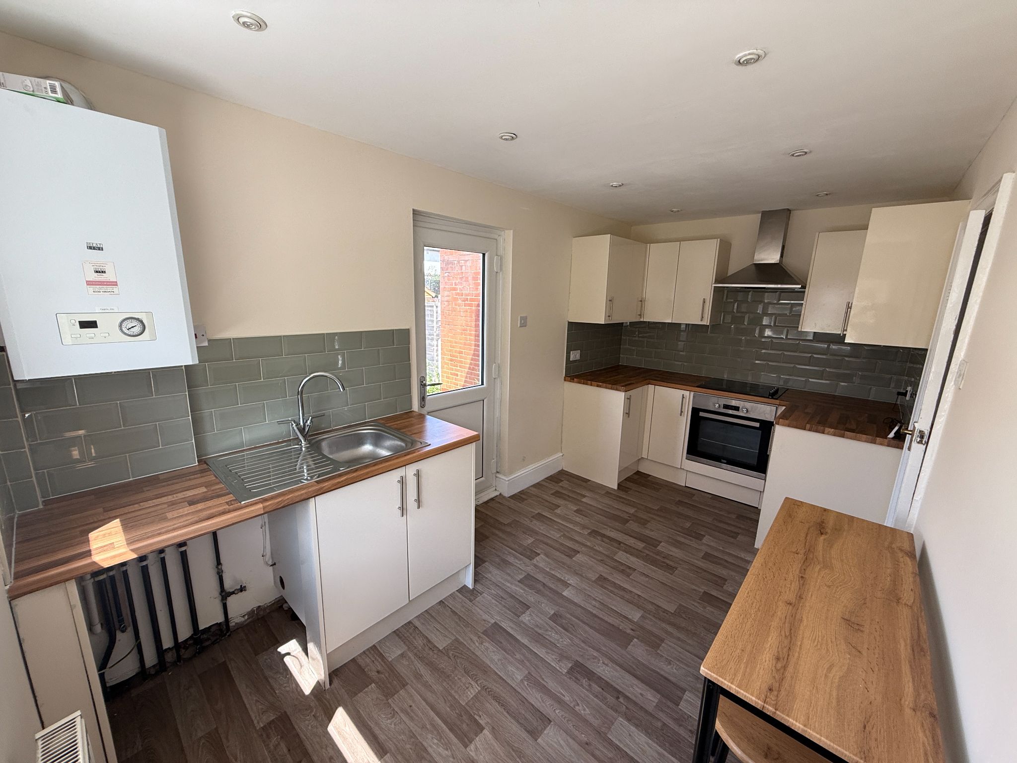 Large modern kitchen area to the rear of the property. Comes with stylish cream wall & base units, oak effect worktops, vinyl flooring, modern grey brick tiles, under stairs storage cupboard and integrated oven, hob and extractor. Rear door leads out to yard area.