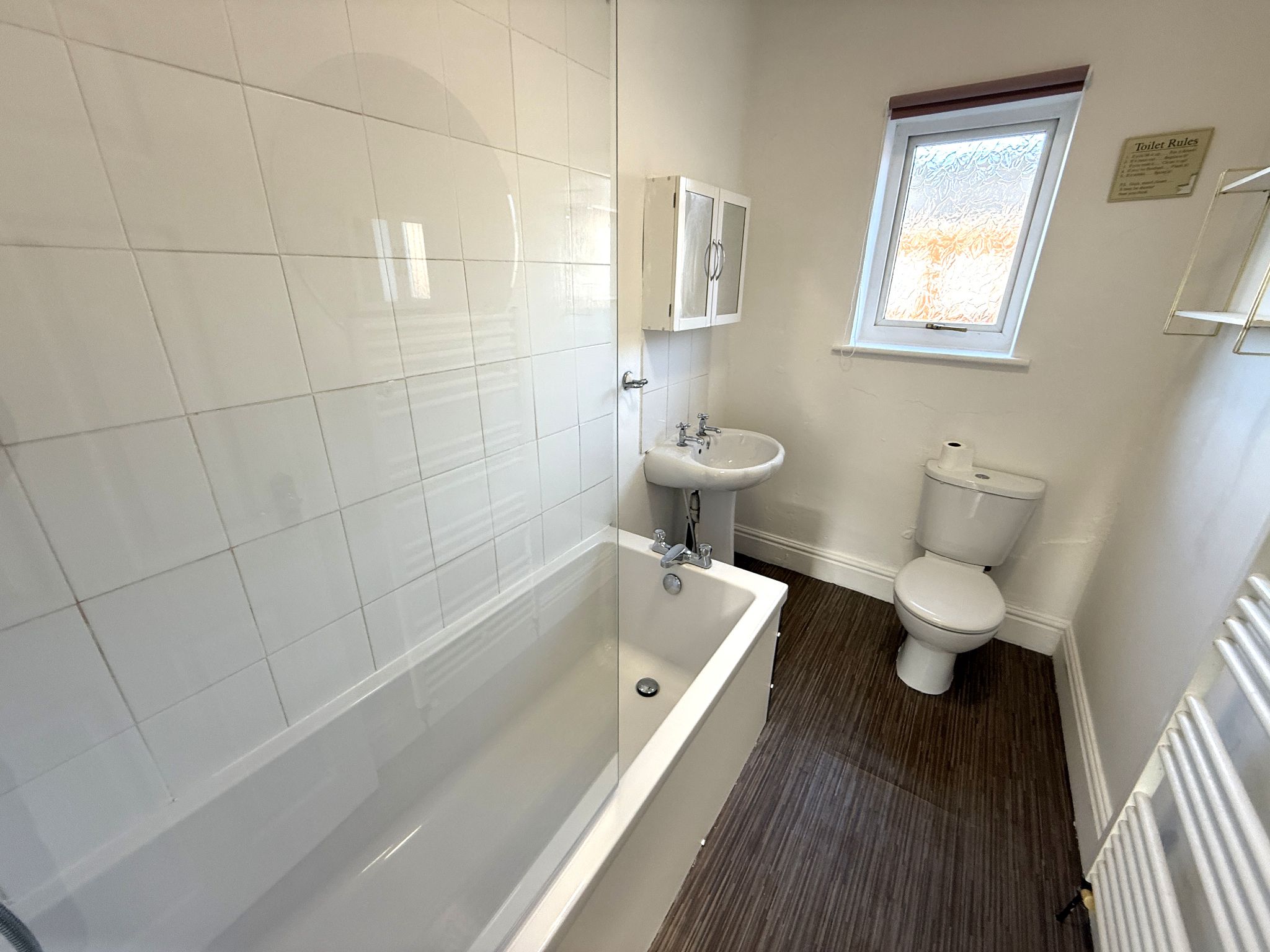 Modern three piece bathroom with vinyl flooring and tiled walls, includes toilet, basin, shower over bath and heated towel rail.