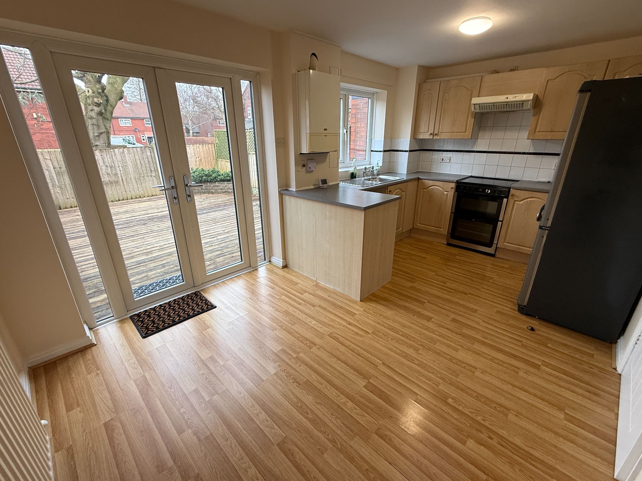 Modern fitted kitchen with beech wall and base units, redecorated walls and wood laminate flooring. Comes with oven, hob & grill and optional fridge freezer. The dining area includes space for a dining table and French doors that lead onto rear garden.