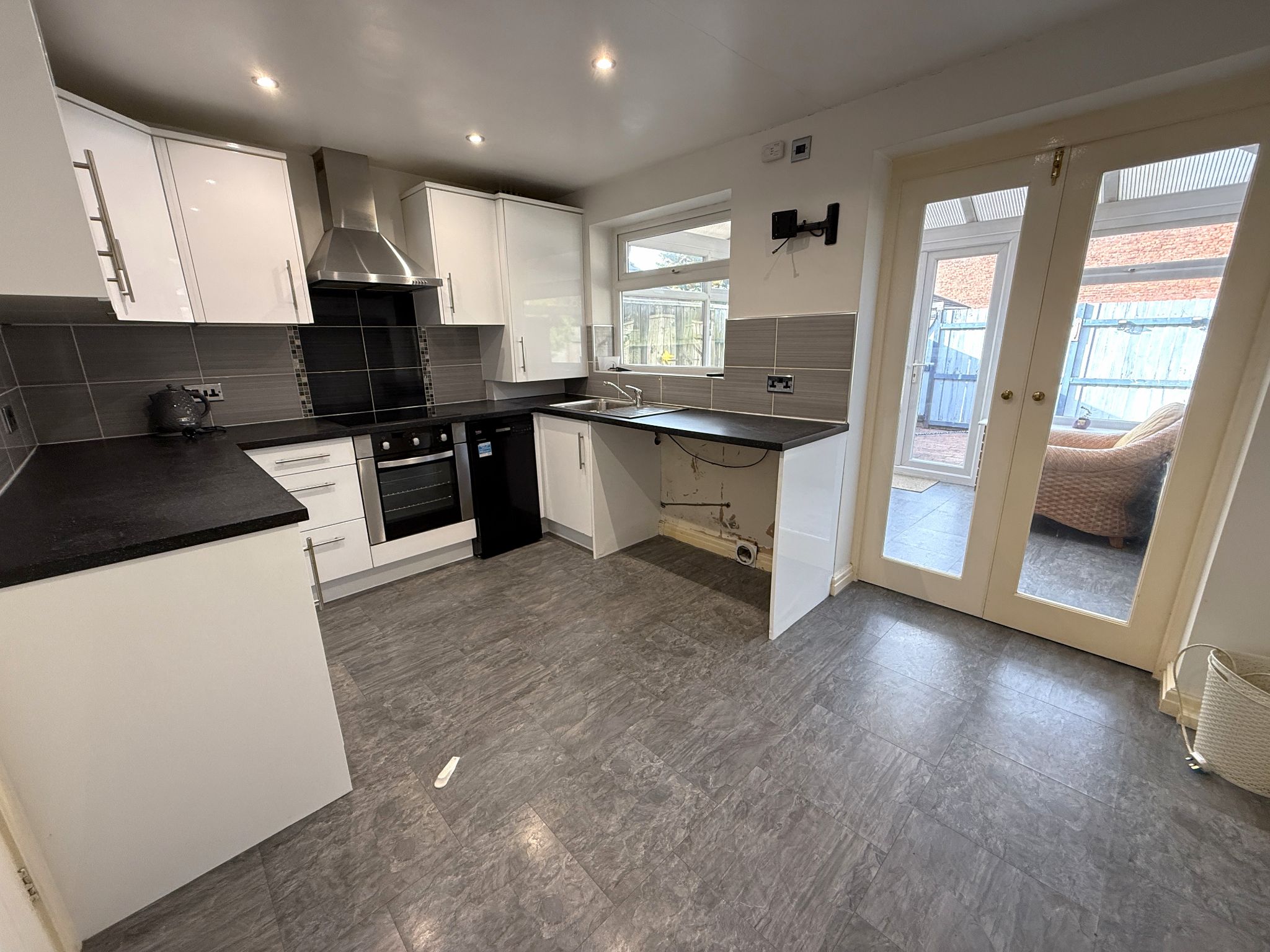 To the rear of the lounge is a modern fitted kitchen, with white wall and base units, black work tops, electric oven and hob, hood extractor fan and space and plumbing for further appliances. The kitchen also boasts space for a dining table, double glazed window and double doors leading to conservatory.