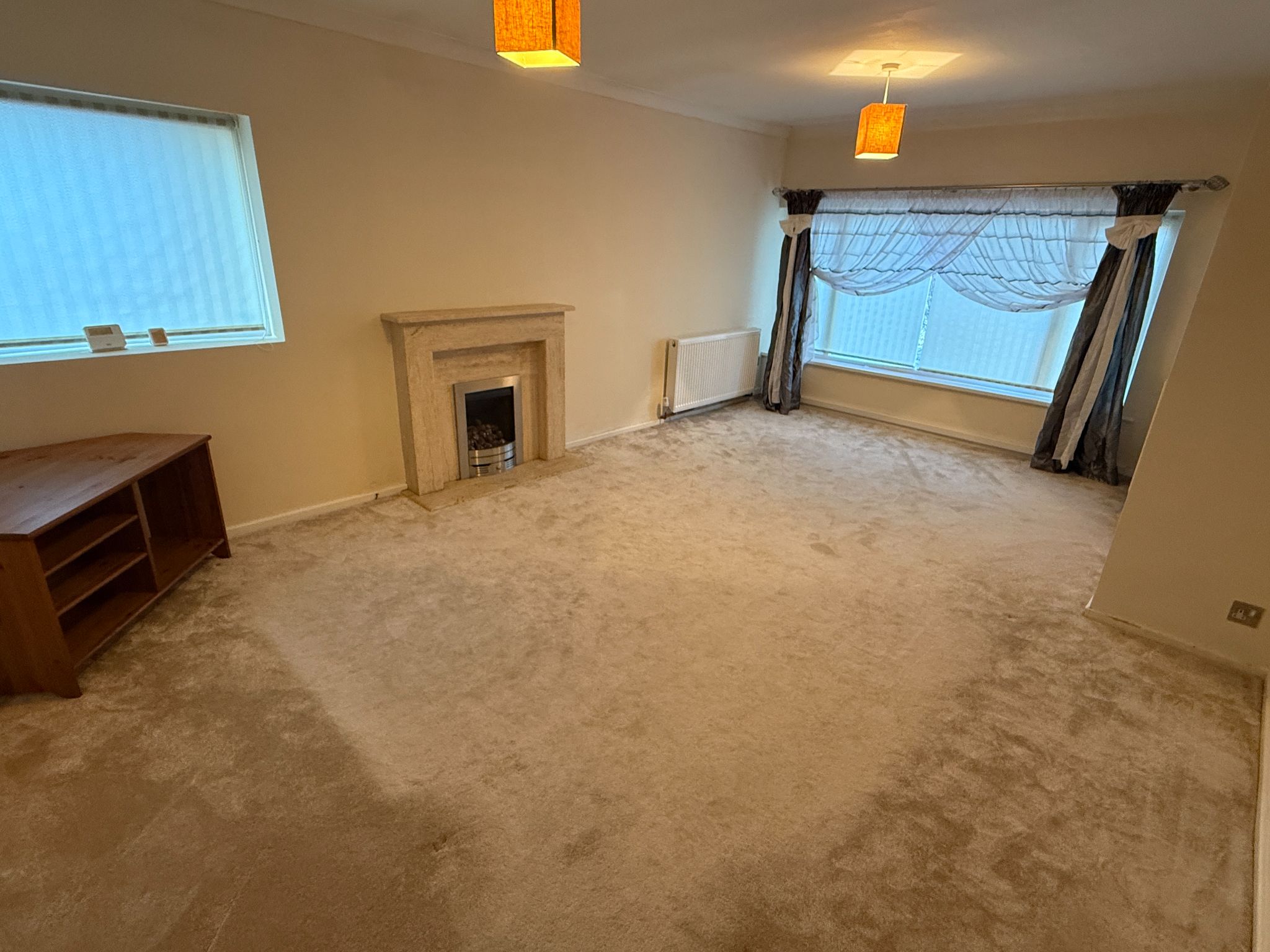 Large lounge with grey carpet, feature fireplace and large window.