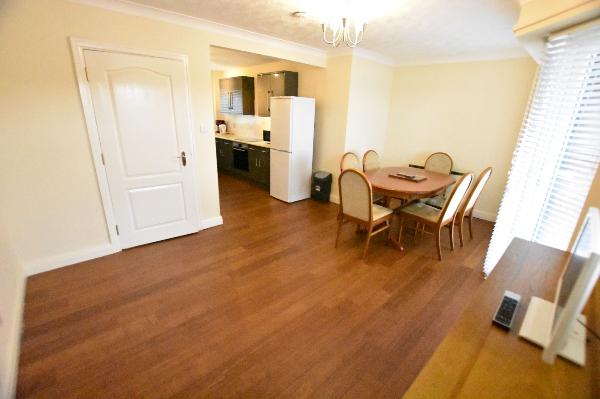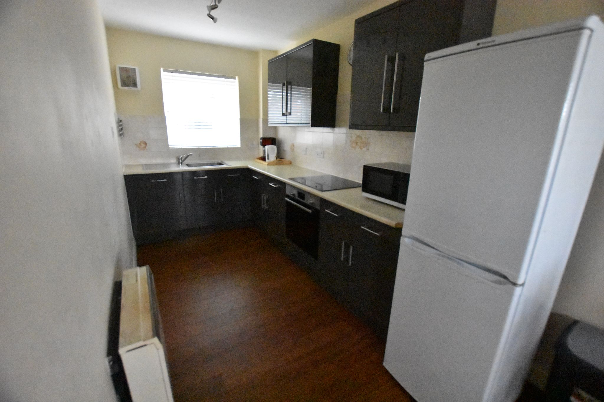 Open plan modern fitted kitchen. Comes with grey wall & base units, cream worktops and wood laminate flooring. There is a washing machine, fridge/freezer, oven, hob & extractor.