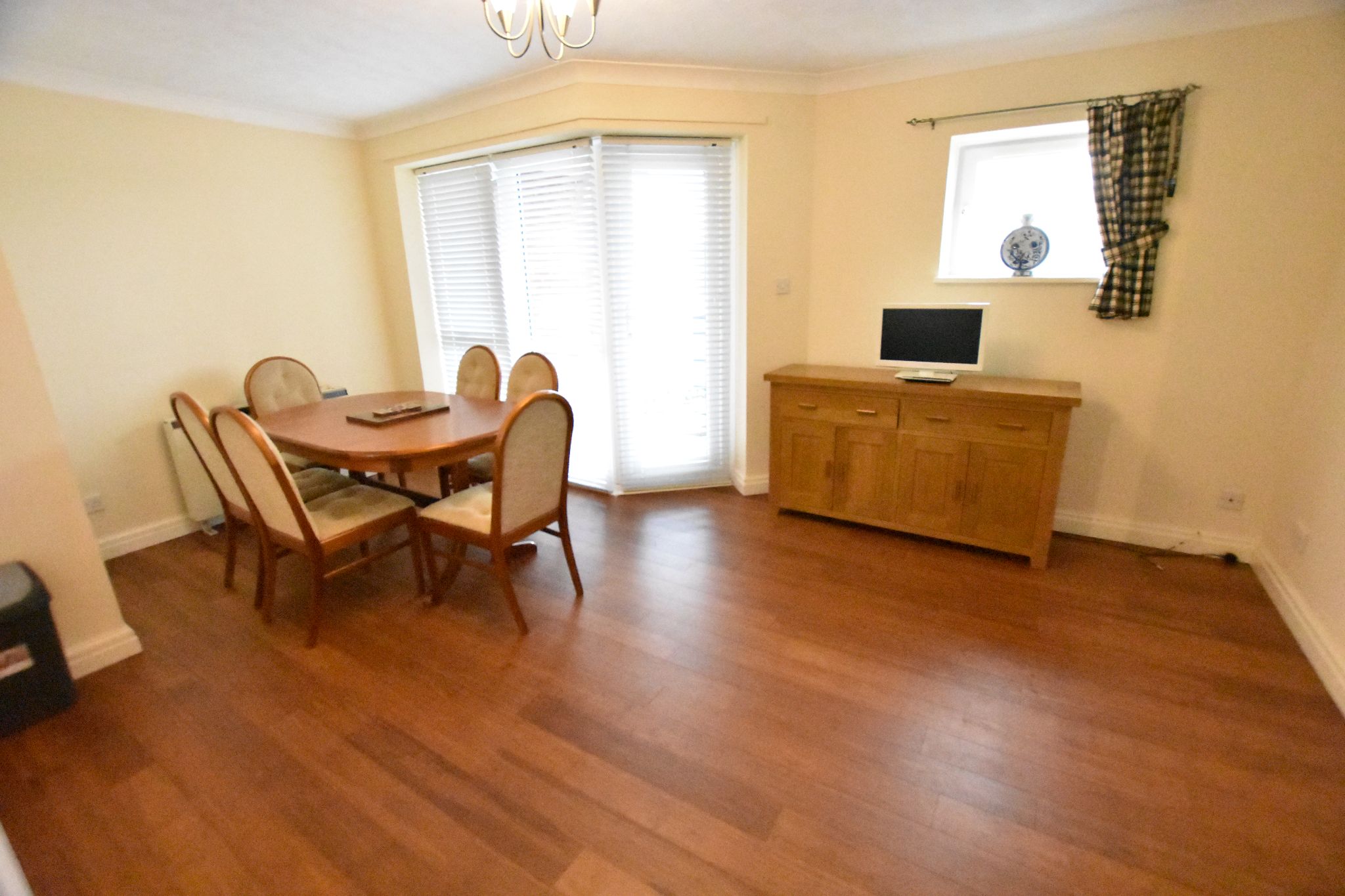 Large open plan dining area with wood laminate flooring and large dining table and chairs. There is patio doors onto a balcony which has stunning views out over the water.