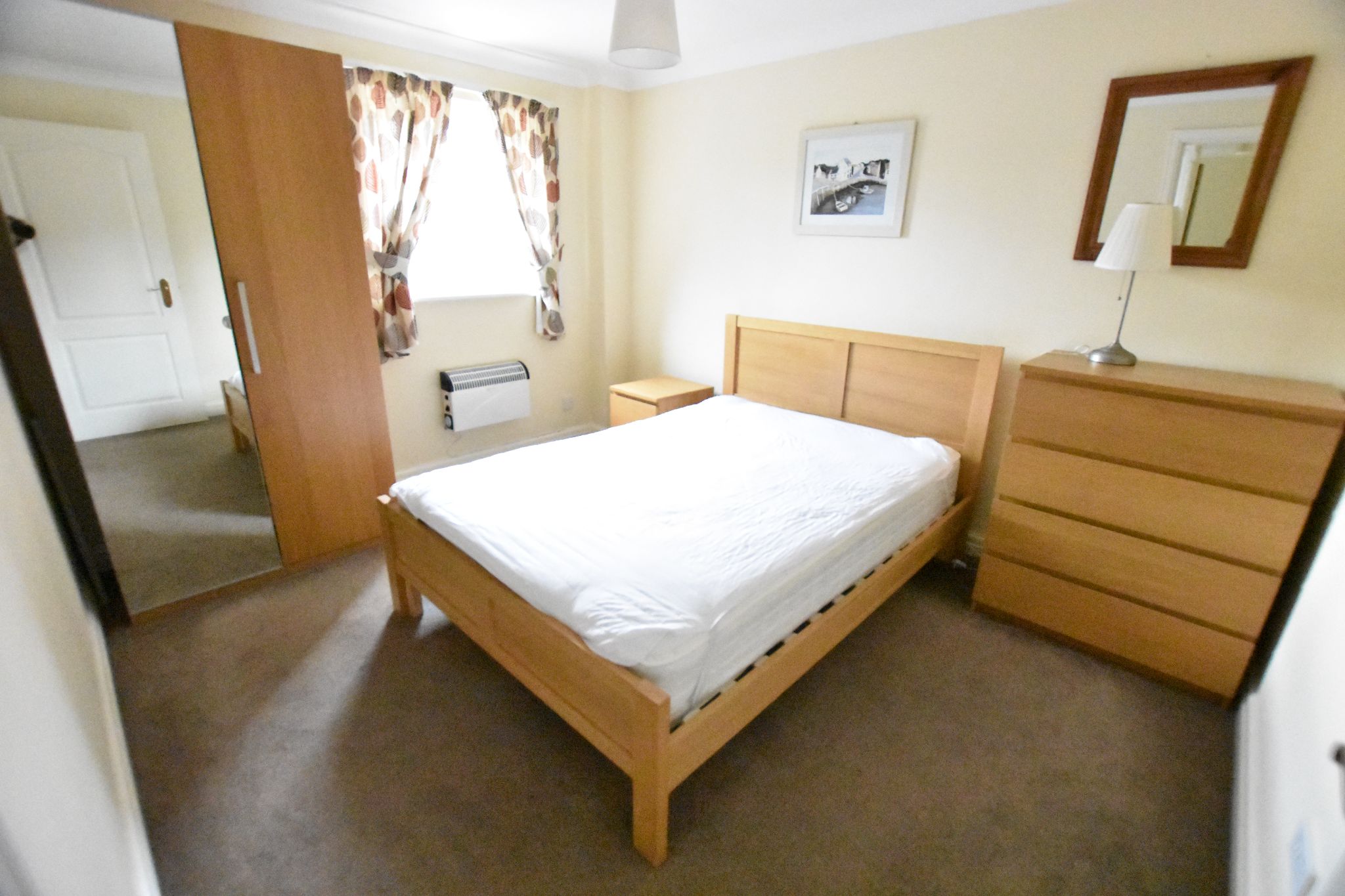 Large furnished double bedroom on the ground floor. Has a double bed, drawers and built in wardrobe. Comes with new carpet and décor, and has views over the marina.