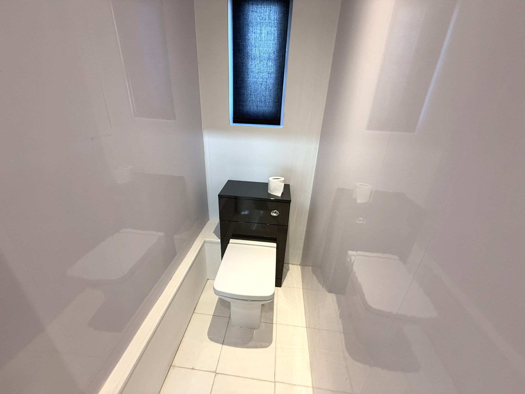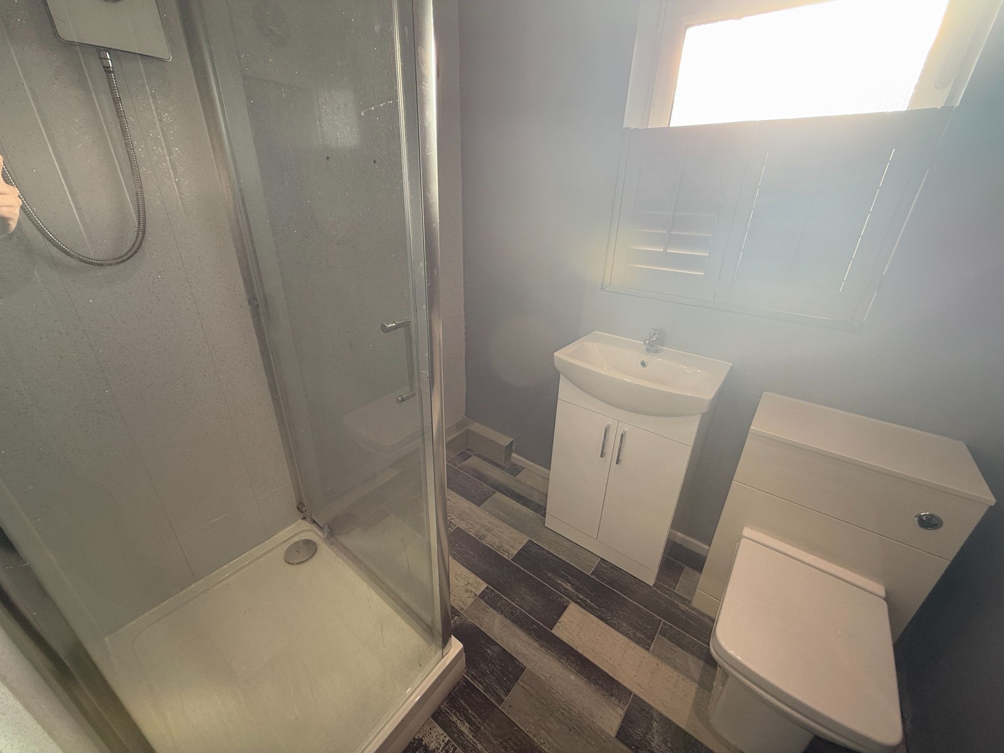 Modern bathroom, with vinyl flooring, WC, basin and walk-in shower.