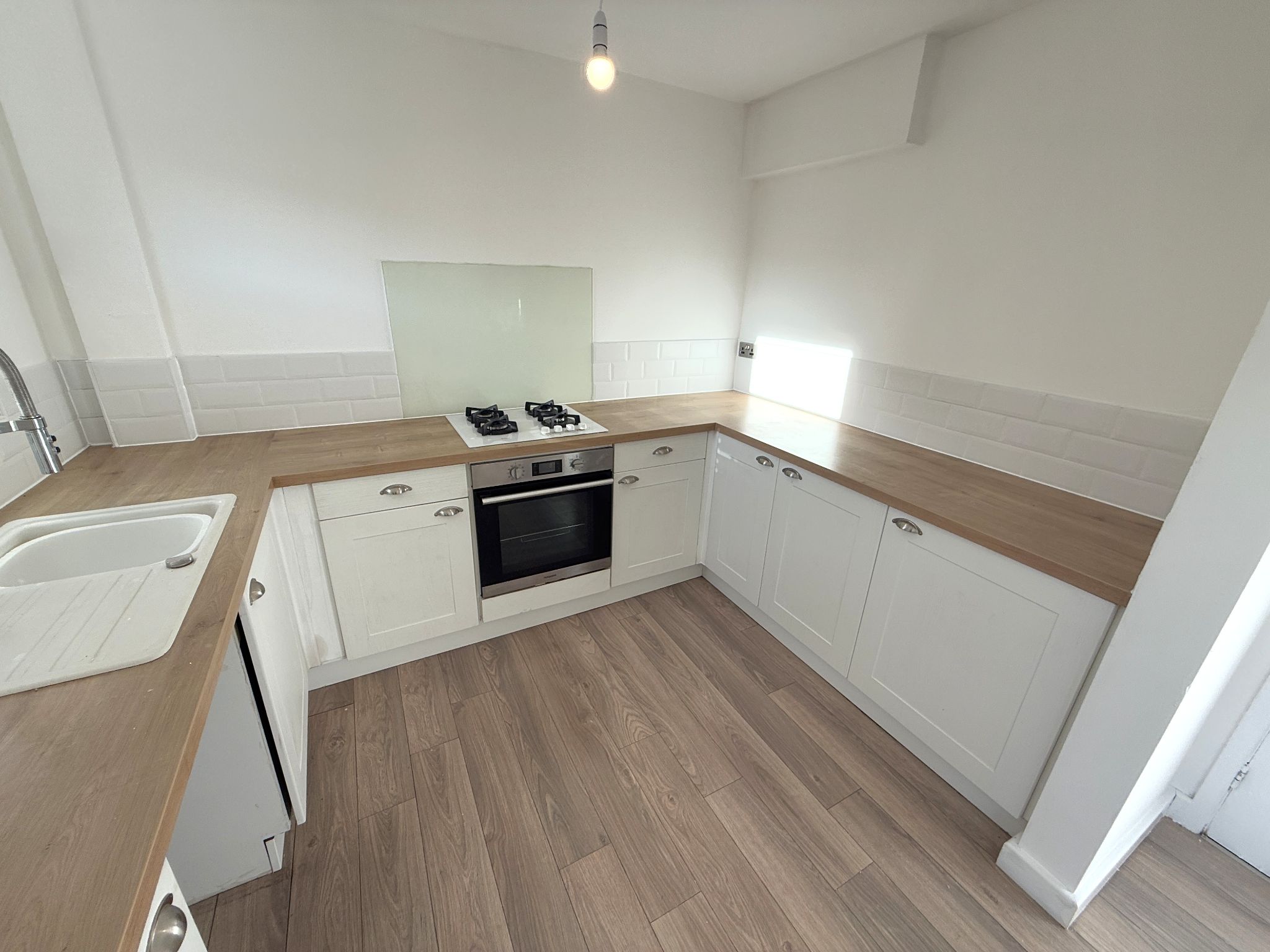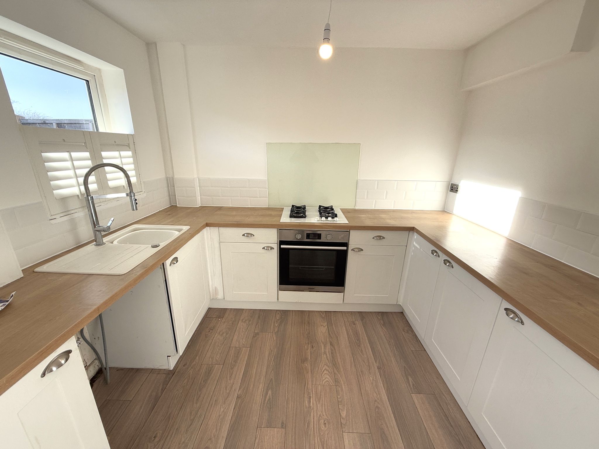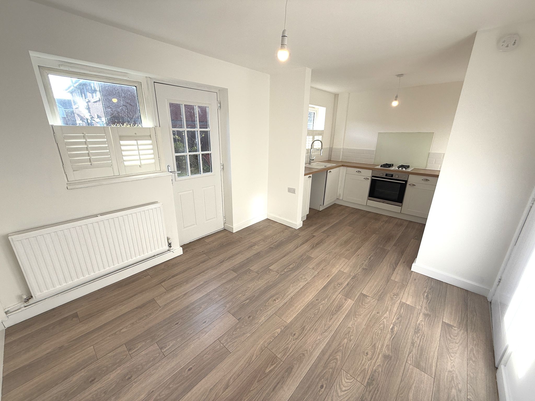 Modern fitted kitchen/diner to the rear, with wood laminate flooring, cream wall & base units, wood effect worktops and integrated oven and hob. Has a space for a large table and chairs, and door leading out to the rear garden.