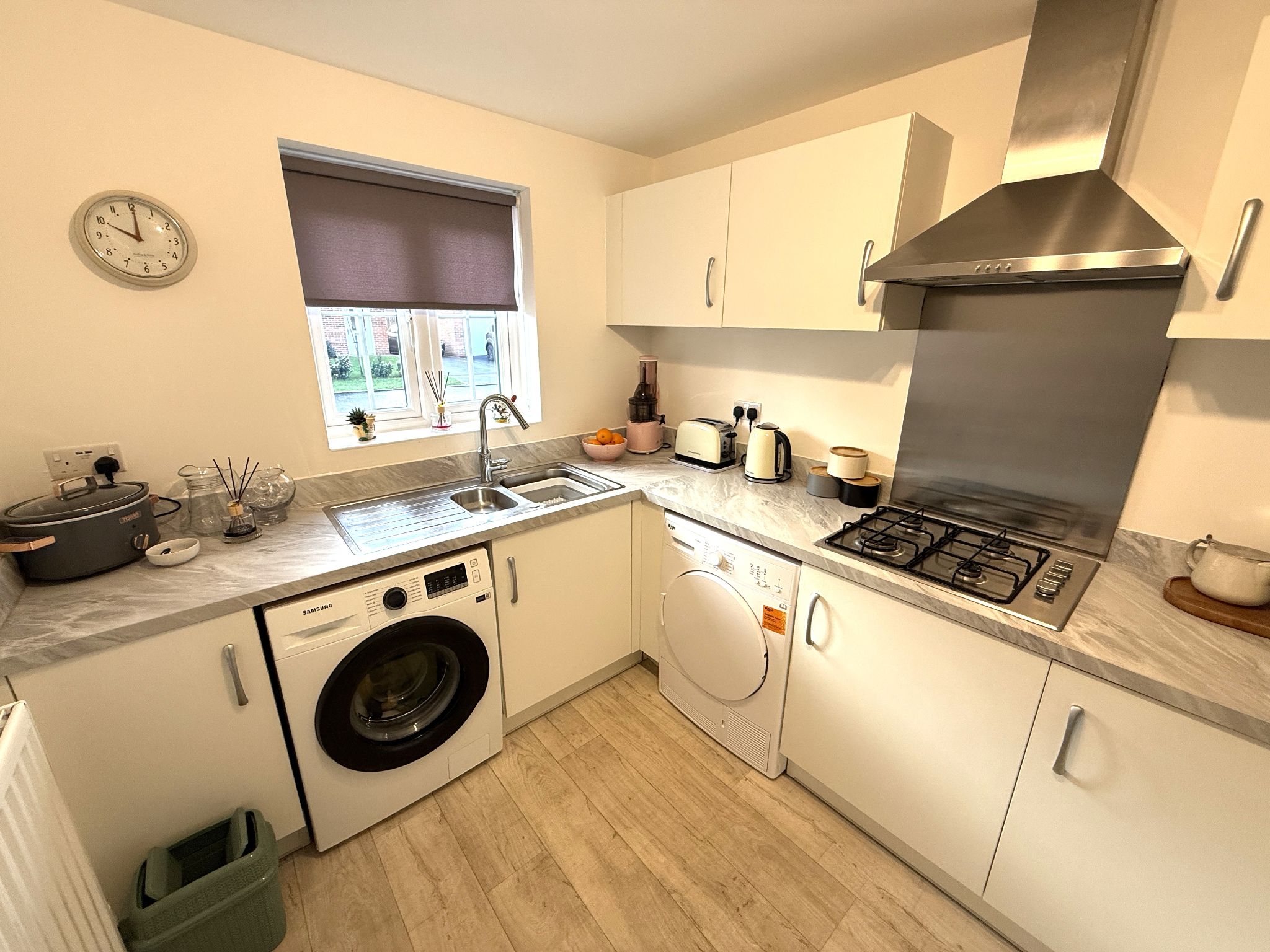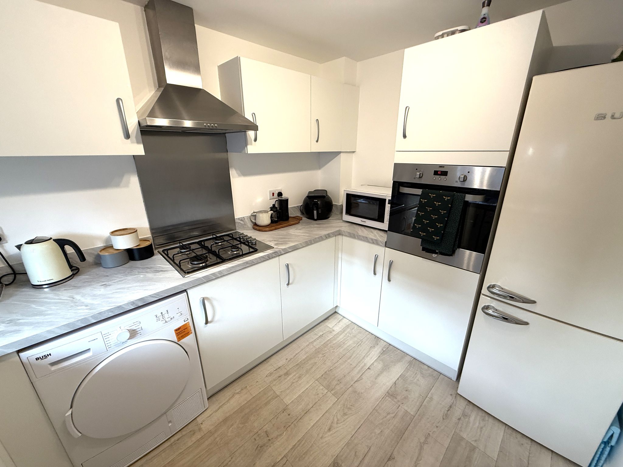Modern fitted kitchen with white wall & base units, grey marble effect worktops and vinyl flooring. Comes with integrated oven, hob and extractor. Space for fridge/freezer, dryer and washing machine.