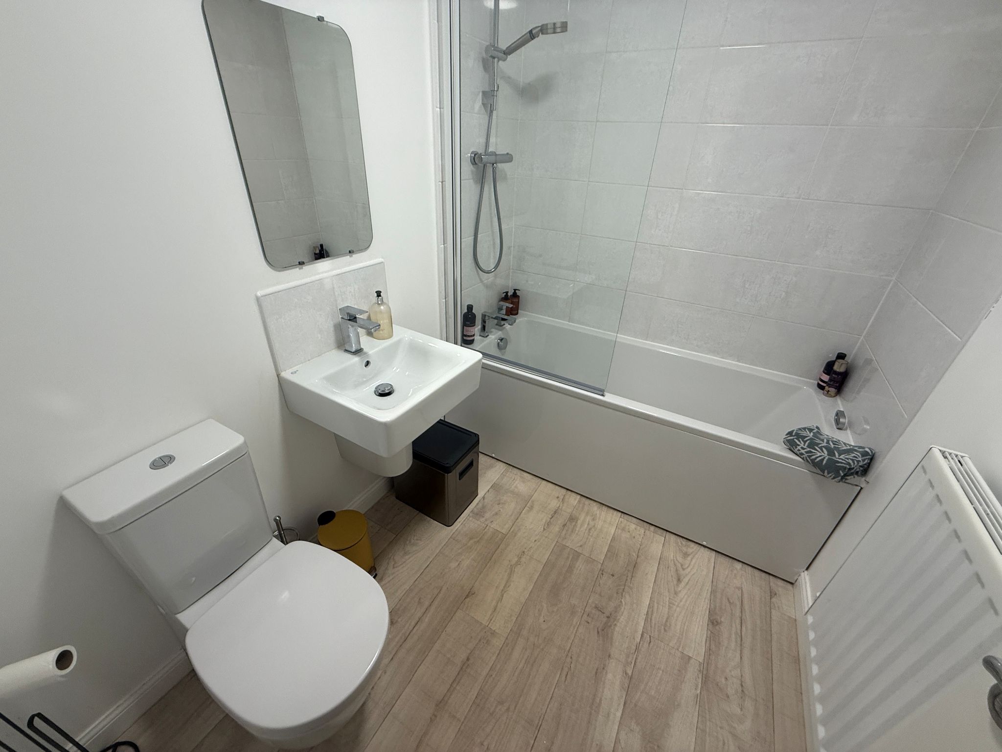 Modern family bathroom with WC, basin, part-tiled walls and shower over bath.