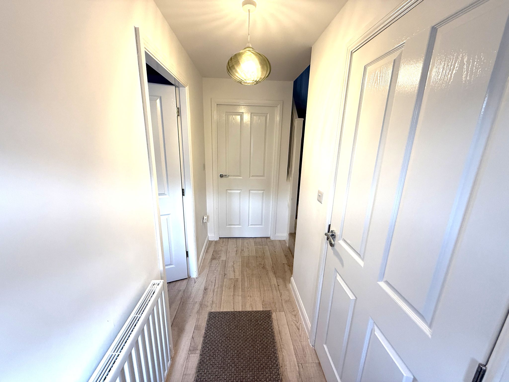 Entrance hallway with wood effect vinyl flooring, leading to.....