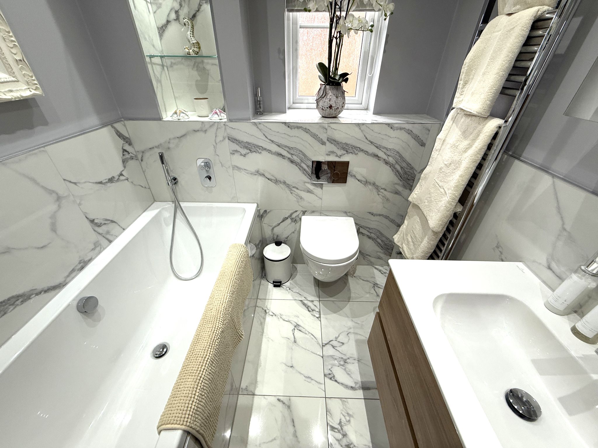 The family bathroom has been impeccably upgraded by the current owners and boasts a toilet with wall mounted flush buttons, bath with hand shower attachment and mixer tap, wall mounted wash hand basin with mixer tap, and tiled shower cubical with fitted shower. The bathroom also features part tiled walls, heated towel rail, obscure double glazed window.