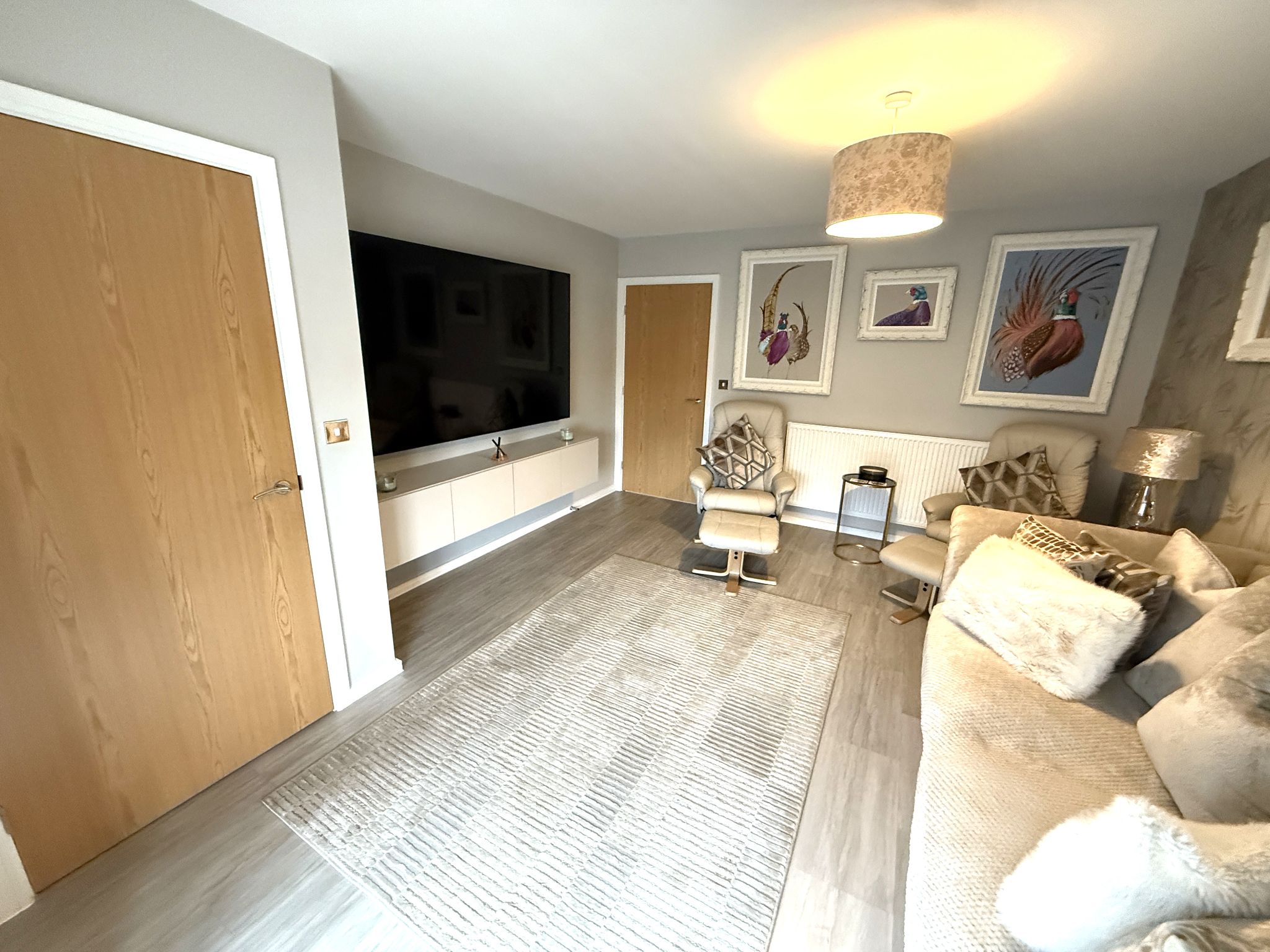 Spacious lounge with box bay window overlooking the front of the property, with storage wall units under the TV and a large radiator.